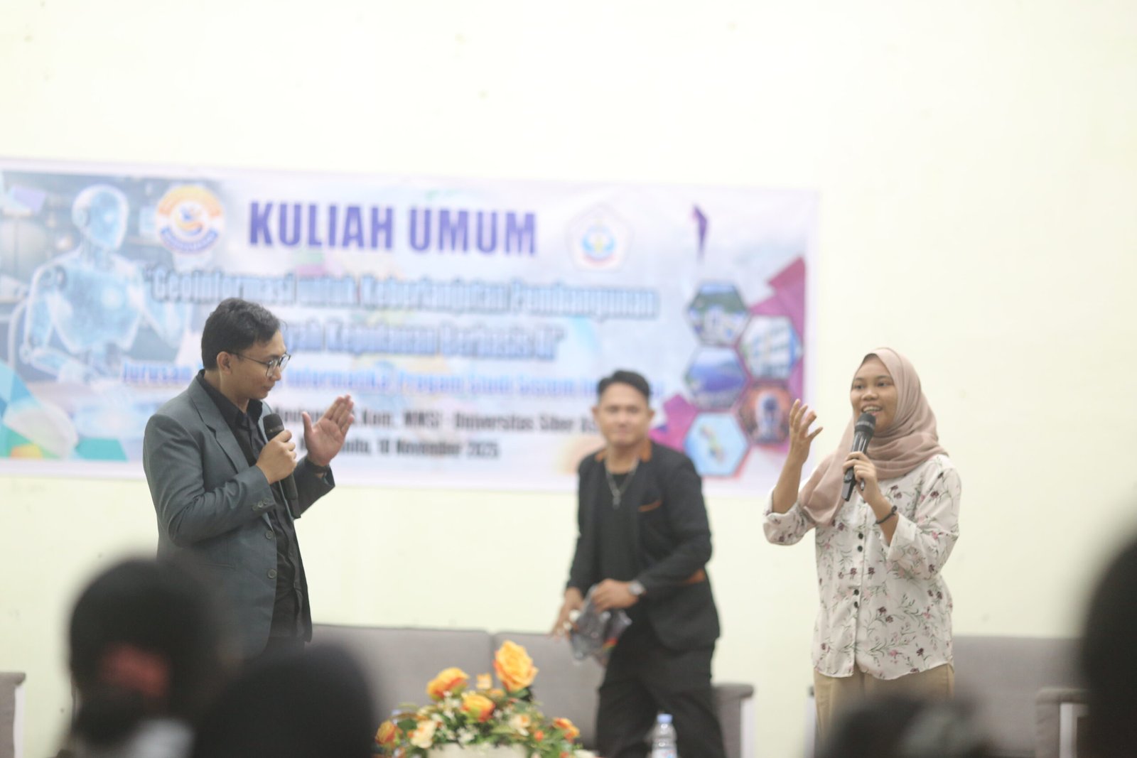 Interaksi di ruangan terasa menyenangkan. Pertanyaan yang muncul tidak hanya teknis, tetapi juga strategis. Mulai dari “Bagaimana memulai kalau laptop terbatas” sampai “Bagaimana peluang karier di bidang geospasial dan AI”. Saya sesekali memberi pertanyaan balik untuk mengasah cara berpikir kritis. Beberapa mahasiswa yang memberikan jawaban menarik mendapatkan merchandise berupa kaos. Hadiah sederhana, tetapi cukup untuk membuat suasana auditorium terasa lebih hidup.